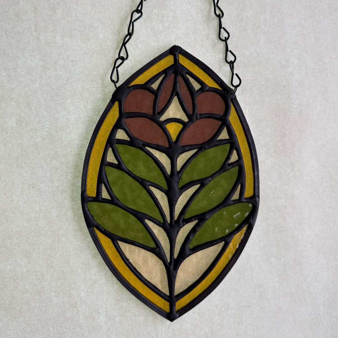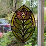 Item made using handout coloured glass, copper foil, lead solder and black patina to give the classical stained glass look.
