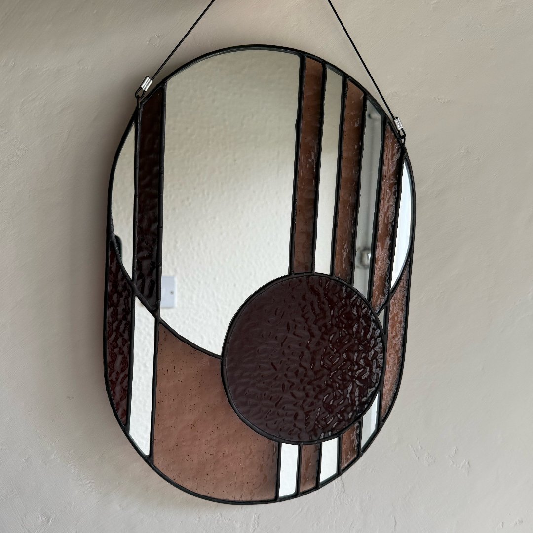 37x26cm Mirror, coloured glass, lead solder and copper foil. hung on a black coated steel wire.