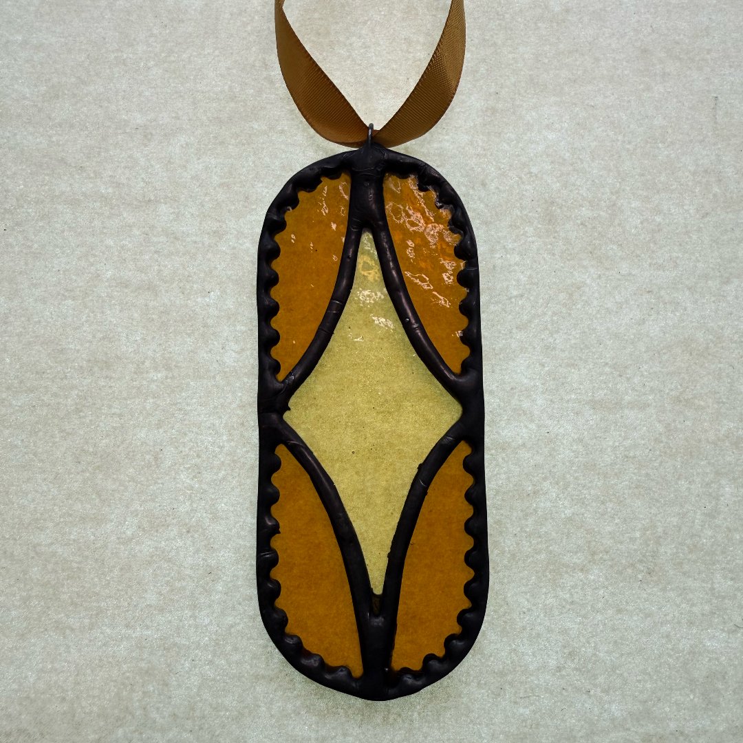 10x4.5cm Made out of coloured glass, lead solder and copper foil, hung on ribbon.