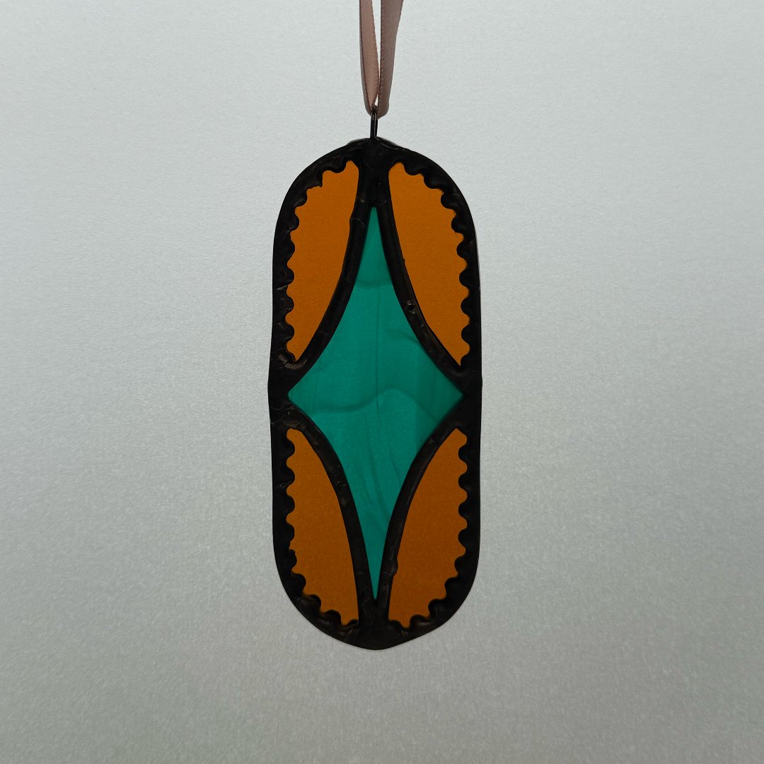 10x4.5cm Made out of coloured glass, lead solder and copper foil, hung on ribbon.