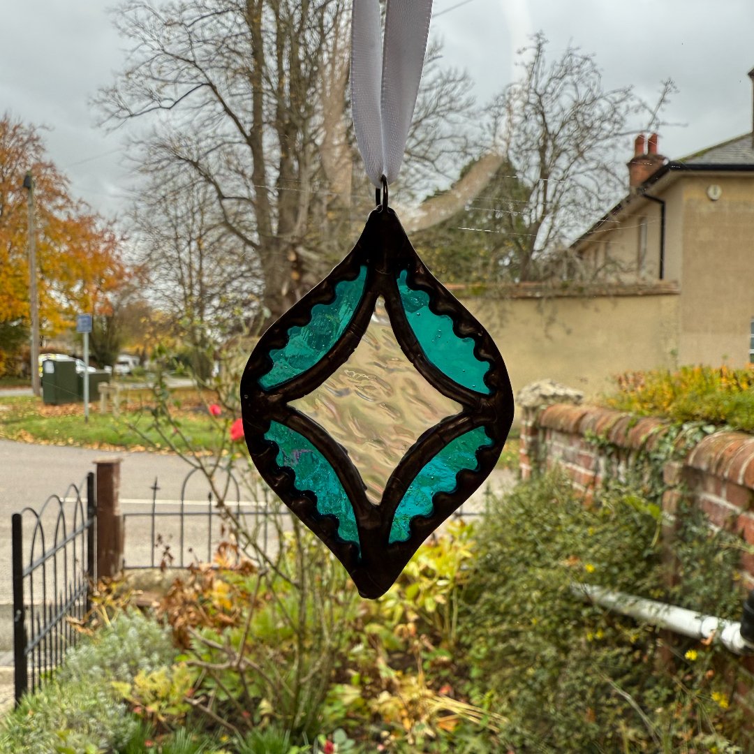 Roughly 7.5x5cm Made out of coloured glass, lead solder and copper foil, hung on ribbon.